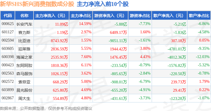 资金流向方面,新华SHS新兴消费(989006)指数成份股当日主力资金净流入合计1.1亿元,游资资金净流入合计3887.86万元,散户资金净流出合计1.49亿元。成份股资金流向详情见下表: