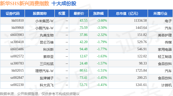 新华SHS新兴消费(989006)指数十大成份股详情如下:
