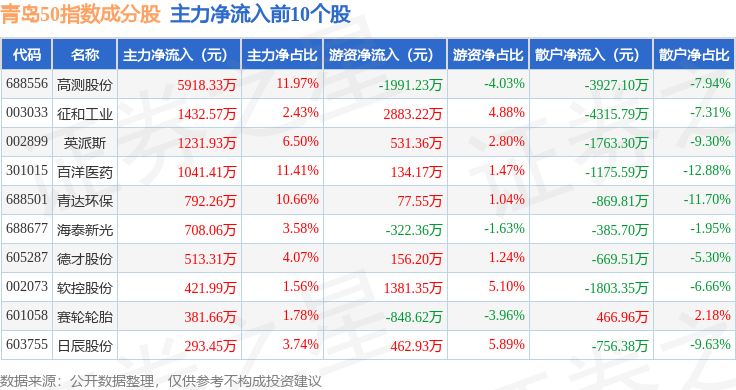 资金流向方面,青岛50(989011)指数成份股当日主力资金净流出合计5.47亿元,游资资金净流入合计3.57亿元,散户资金净流入合计1.89亿元。成份股资金流向详情见下表: