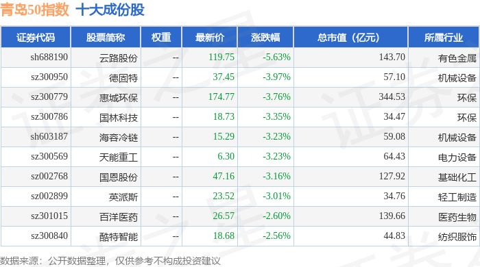 青岛50(989011)指数十大成份股详情如下: