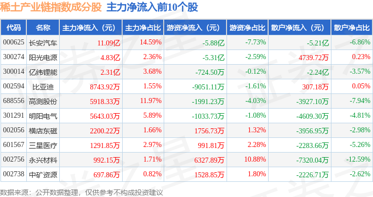 资金流向方面,稀土产业链(989013)指数成份股当日主力资金净流出合计26.76亿元,游资资金净流入合计1.78亿元,散户资金净流入合计24.98亿元。成份股资金流向详情见下表: