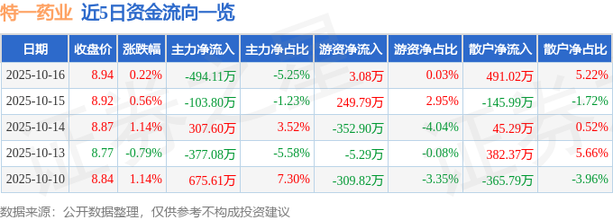 证券之星消息,截至2025年10月16日收盘,特一药业(002728)报收于8.94元,上涨0.22%,换手率2.79%,成交量10.49万手,成交额9406.17万元。