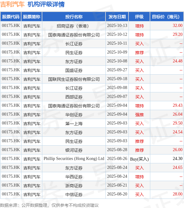 投行对该股的评级以买入为主,近90天内共有30家投行给出买入评级,近90天的目标均价为26.81港元。招商证券(香港)最新一份研报给予吉利汽车增持评级,目标价32港元。