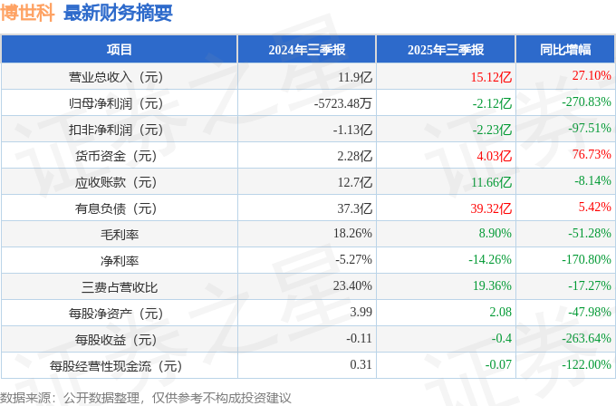 据证券之星公开数据整理,近期博世科(300422)发布2025年三季报。截至本报告期末,公司营业总收入15.12亿元,同比上升27.1%,归母净利润-2.12亿元,同比下降270.83%。按单季度数据看,第三季度营业总收入2.6亿元,同比上升60.61%,第三季度归母净利润-1.65亿元,同比下降97.59%。本报告期博世科短期债务压力上升,流动比率达0.62。