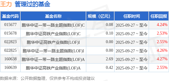 王力先生:国籍中国,工学硕士。曾任上海华腾软件系统有限公司软件工程师,中国金融期货交易所技术部软件高级工程师。2017年11月加盟鹏华基金管理有限公司,历任量化及衍生品投资部高级量化研究员、资深量化研究员,现担任指数与量化投资部基金经理。王力具备基金从业资格。2025年09月27日担任鹏华中证高铁产业指数型证券投资基金(LOF)、鹏华中证一带一路主题指数型证券投资基金(LOF)基金经理。