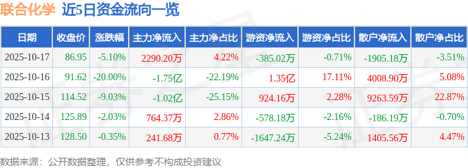 证券之星消息,截至2025年10月17日收盘,联合化学(301209)报收于86.95元,下跌5.1%,换手率11.81%,成交量6.42万手,成交额5.43亿元。