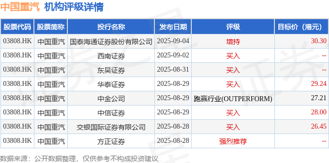 投行对该股的评级以买入为主,近90天内共有5家投行给出买入评级,近90天的目标均价为28.24港元。国泰海通证券股份有限公司最新一份研报给予中国重汽增持评级,目标价30.3港元。