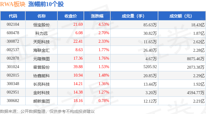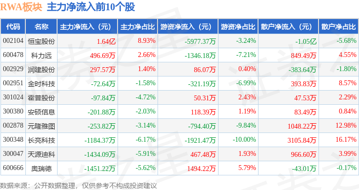 从资金流向上来看,当日RWA板块主力资金净流出1.47亿元,游资资金净流出8158.2万元,散户资金净流入2.29亿元。RWA板块个股资金流向见下表: