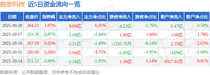 证券之星消息,截至2025年10月20日收盘,胜宏科技(300476)报收于264.22元,上涨1.87%,换手率6.66%,成交量57.0万手,成交额152.64亿元。