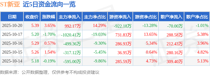 证券之星消息,截至2025年10月20日收盘,ST新亚(002388)报收于5.39元,上涨3.65%,换手率2.58%,成交量13.07万手,成交额6941.79万元。