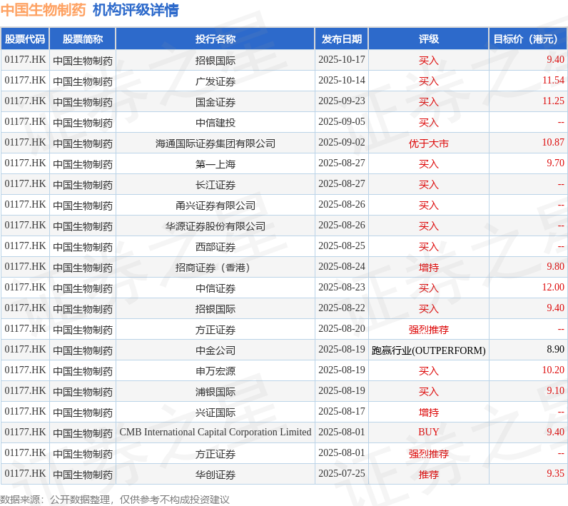 投行对该股的评级以买入为主,近90天内共有13家投行给出买入评级,近90天的目标均价为10.07港元。招银国际最新一份研报给予中国生物制药买入评级,目标价9.4港元。