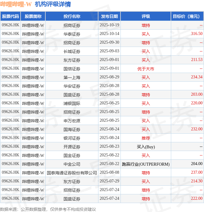 投行对该股的评级以买入为主,近90天内共有10家投行给出买入评级,近90天的目标均价为229.47港元。招商证券最新一份研报给予哔哩哔哩-W增持评级。