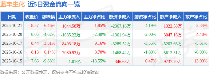 证券之星10月21日盘中消息,14点1分蓝丰生化(002513)触及涨停板。目前价格8.86,上涨10.06%。其所属行业农化制品目前上涨。领涨股为蓝丰生化。该股为光伏,大农业,农药概念热股,当日光伏概念上涨1.15%,大农业概念上涨0.87%,农药概念上涨0.64%。