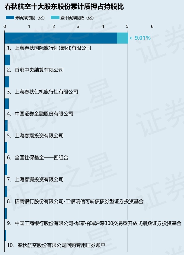 截止本公告日,股东上海春秋国际旅行社(集团)有限公司已累计质押股份4540.0万股,占其持股总数的9.01%。本次质押后春秋航空十大股东的累计质押股份占持股比例(占持股比例的计算以公司最新一期财务报表公布的十大股东的持股总数为基准)见下图: