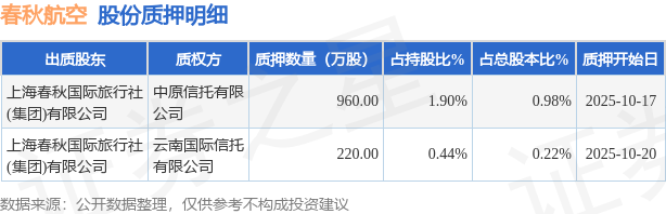 证券之星消息,春秋航空(601021)10月22日公开信息显示,股东上海春秋国际旅行社(集团)有限公司向中原信托有限公司、云南国际信托有限公司合计质押1180.0万股,占总股本1.2%。质押详情见下表: