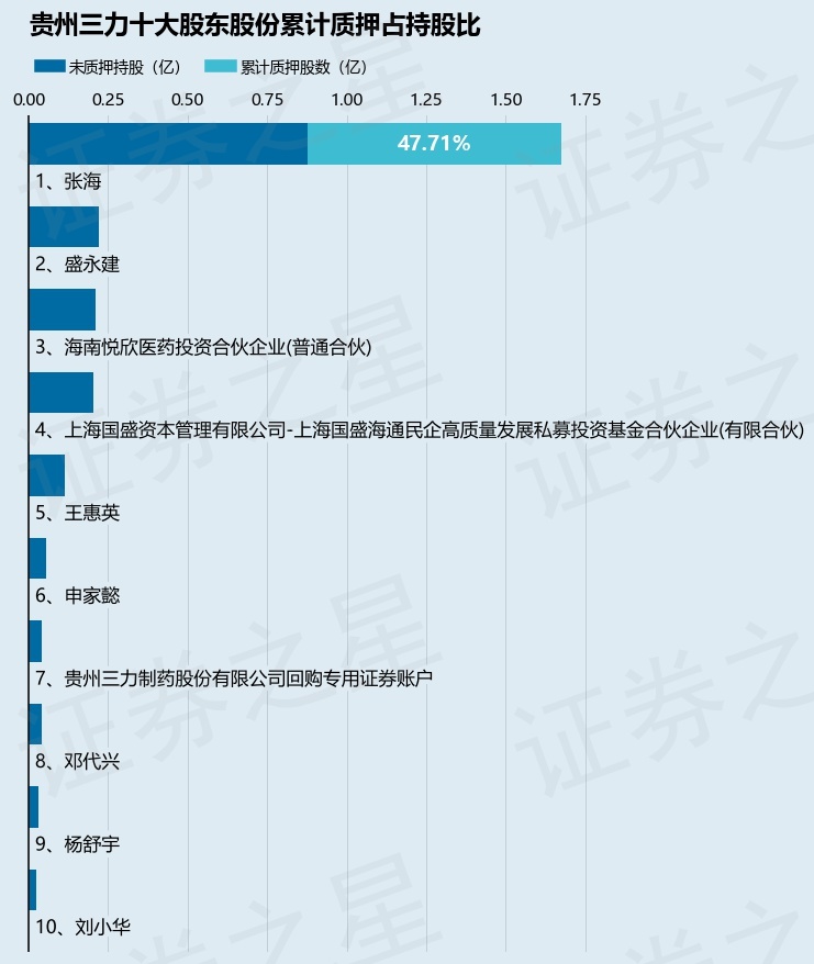 截止本公告日,股东张海已累计质押股份8000.0万股,占其持股总数的47.71%。本次质押后贵州三力十大股东的累计质押股份占持股比例(占持股比例的计算以公司最新一期财务报表公布的十大股东的持股总数为基准)见下图: