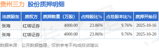 证券之星消息,贵州三力(603439)10月22日公开信息显示,股东张海向红塔证券合计质押8000.0万股,占总股本19.52%。质押详情见下表:
