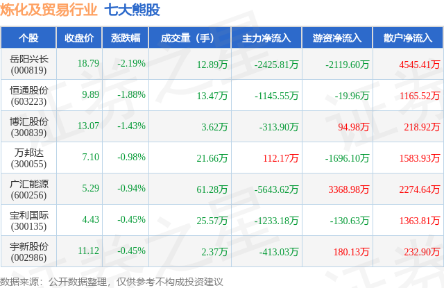 个股表现方面,炼化及贸易行业当日领跌股为岳阳兴长(000819),该股当日报收18.79,下跌2.19%,成交量12.89万,主力资金净流出2425.81万元。恒通股份(603223)以下跌1.88%紧随其后,该股当日成交量13.47万,主力资金净流出1145.55万元。除此之外,博汇股份(300839)、万邦达(300055)、广汇能源(600256)均进入当日熊股之列。具体个股列表见下表: