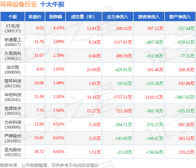 个股表现方面,环保设备行业当日领涨股为ST先河(300137),该股当日报收8.02,上涨4.43%,成交量13.81万,主力资金净流入330.32万元。宇通重工(600817)以上涨2.89%紧随其后,该股当日成交量8.34万,主力资金净流入1117.01万元。除此之外,久吾高科(300631)、法尔胜(000890)、楚环科技(001336)均进入当日牛股之列。具体个股列表见下表: