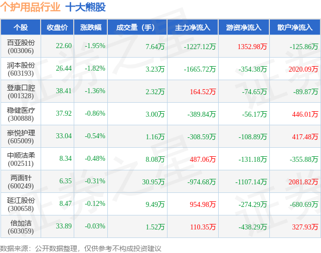 个股表现方面,个护用品行业当日领跌股为百亚股份(003006),该股当日报收22.6,下跌1.95%,成交量7.64万,主力资金净流出1227.12万元。润本股份(603193)以下跌1.82%紧随其后,该股当日成交量3.23万,主力资金净流出1665.72万元。除此之外,登康口腔(001328)、稳健医疗(300888)、豪悦护理(605009)均进入当日熊股之列。具体个股列表见下表: