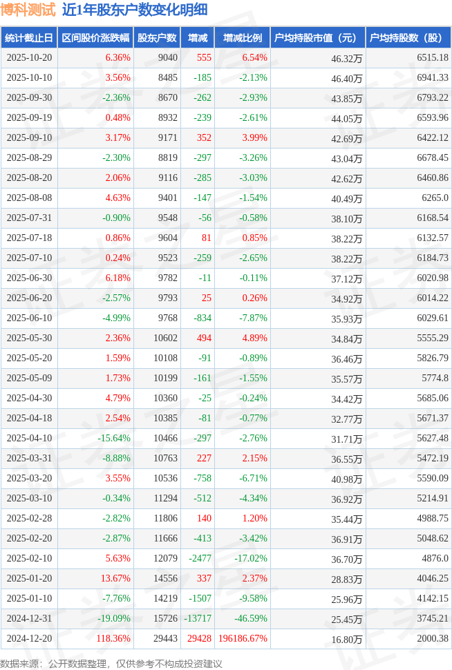 从股价来看,2025年10月10日至2025年10月20日,博科测试区间涨幅为6.36%,在此期间股东户数增加555.0户,增幅为6.54%。