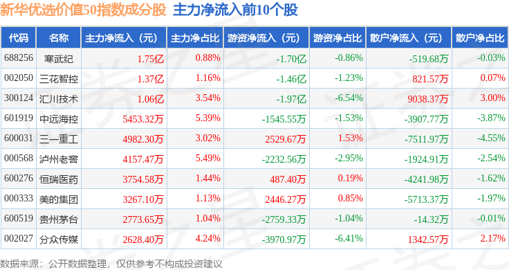 资金流向方面,新华优选价值50(989004)指数成份股当日主力资金净流出合计74.28亿元,游资资金净流入合计33.27亿元,散户资金净流入合计41.02亿元。成份股资金流向详情见下表: