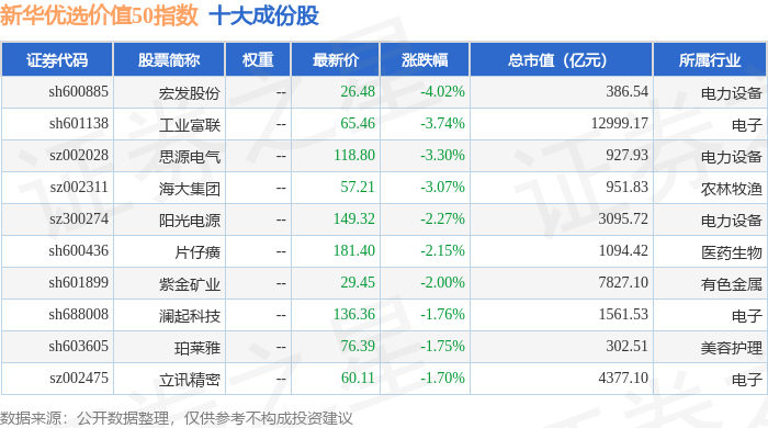新华优选价值50(989004)指数十大成份股详情如下: