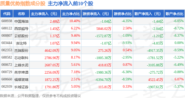 资金流向方面,质量优势(989017)指数成份股当日主力资金净流出合计15.27亿元,游资资金净流入合计7.7亿元,散户资金净流入合计7.57亿元。成份股资金流向详情见下表: