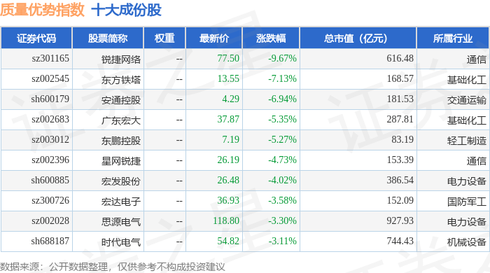 质量优势(989017)指数十大成份股详情如下: