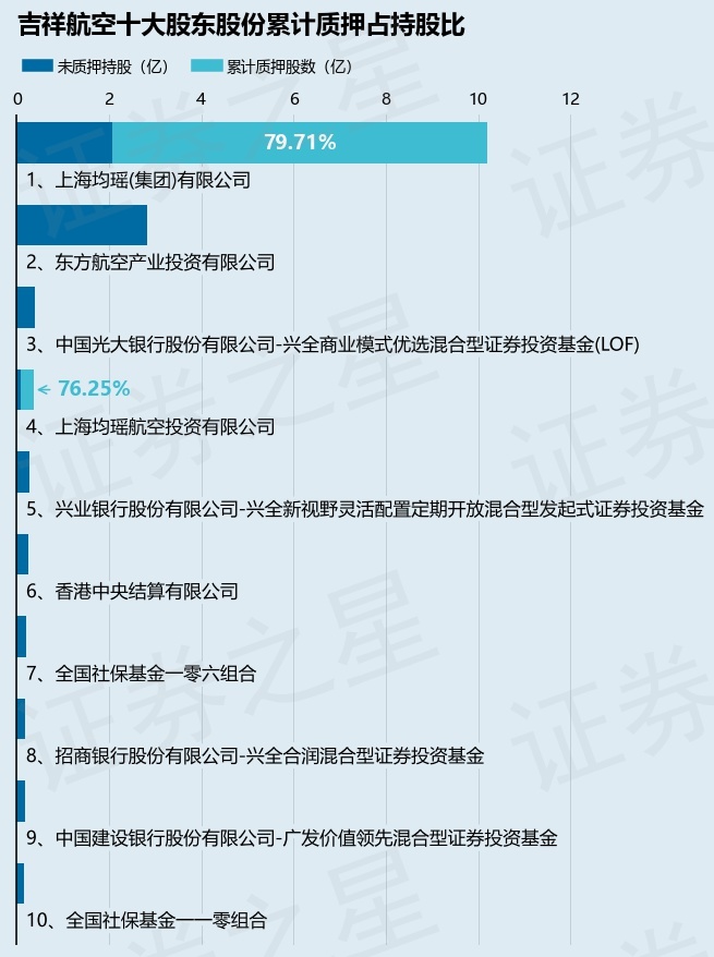 截止本公告日,股东上海均瑶(集团)有限公司已累计质押股份8.14亿股,占其持股总数的79.71%,股东上海均瑶航空投资有限公司已累计质押股份2750.0万股,占其持股总数的76.25%。本次质押后吉祥航空十大股东的累计质押股份占持股比例(占持股比例的计算以公司最新一期财务报表公布的十大股东的持股总数为基准)见下图: