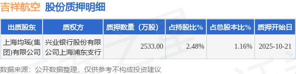 证券之星消息,吉祥航空(603885)10月22日公开信息显示,股东上海均瑶(集团)有限公司向兴业银行股份有限公司上海浦东支行合计质押2533.0万股,占总股本1.16%。质押详情见下表: