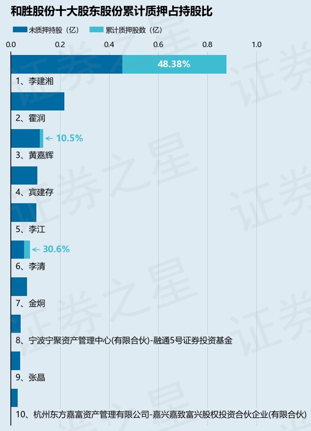 截止本公告日,股东李建湘已累计质押股份4253.0万股,占其持股总数的48.38%,股东黄嘉辉已累计质押股份140.0万股,占其持股总数的10.5%,股东李清已累计质押股份243.0万股,占其持股总数的30.6%。本次质押后和胜股份十大股东的累计质押股份占持股比例(占持股比例的计算以公司最新一期财务报表公布的十大股东的持股总数为基准)见下图: