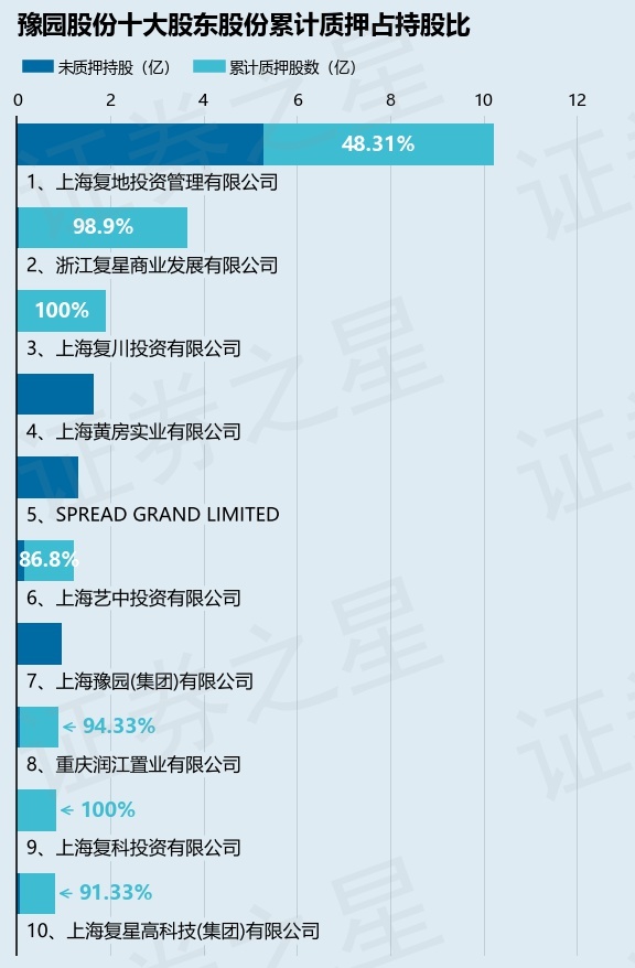 截止本公告日,股东上海复地投资管理有限公司已累计质押股份4.94亿股,占其持股总数的48.31%,股东浙江复星商业发展有限公司已累计质押股份3.61亿股,占其持股总数的98.9%,股东上海复川投资有限公司已累计质押股份1.9亿股,占其持股总数的100.0%,股东上海艺中投资有限公司已累计质押股份1.05亿股,占其持股总数的86.8%,股东重庆润江置业有限公司已累计质押股份8420.0万股,占其持股总数的94.33%,股东上海复科投资有限公司已累计质押股份8438.97万股,占其持股总数的100.0%,股东上海复星高科技(集团)有限公司已累计质押股份7457.0万股,占其持股总数的91.33%。本次质押后豫园股份十大股东的累计质押股份占持股比例(占持股比例的计算以公司最新一期财务报表公布的十大股东的持股总数为基准)见下图: