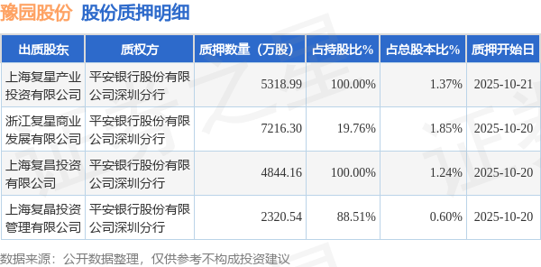 证券之星消息,豫园股份(600655)10月22日公开信息显示,股东上海复星产业投资有限公司、浙江复星商业发展有限公司、上海复昌投资有限公司、上海复晶投资管理有限公司向平安银行股份有限公司深圳分行合计质押1.97亿股,占总股本5.06%。质押详情见下表: