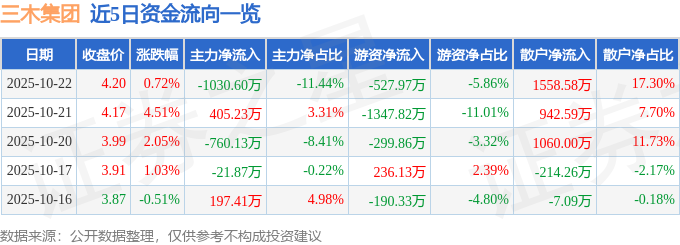 证券之星消息,截至2025年10月22日收盘,三木集团(000632)报收于4.2元,上涨0.72%,换手率4.62%,成交量21.52万手,成交额9007.22万元。