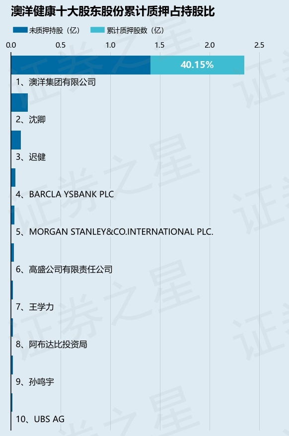 截止本公告日,股东澳洋集团有限公司已累计质押股份9450.0万股,占其持股总数的40.15%。本次质押后澳洋健康十大股东的累计质押股份占持股比例(占持股比例的计算以公司最新一期财务报表公布的十大股东的持股总数为基准)见下图: