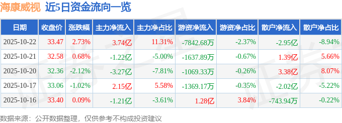 10月22日的资金流向数据方面,主力资金净流入3.74亿元,占总成交额11.31%,游资资金净流出7842.68万元,占总成交额2.37%,散户资金净流出2.95亿元,占总成交额8.94%。