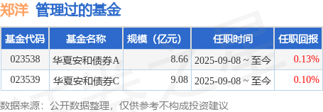 郑洋先生:硕士,2017年7月至2019年10月,曾任中国工商银行股份有限公司资产管理部研究员;2019年11月至2025年6月,曾任工银理财有限责任公司投资经理等。2025年7月加入华夏基金管理有限公司,历任固定收益部基金经理助理。2025年9月8日任华夏安和债券型证券投资基金基金经理。