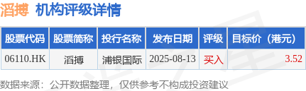 投行对该股的评级以买入为主,近90天内共有1家投行给出买入评级,近90天的目标均价为3.52港元。浦银国际最新一份研报给予滔搏买入评级,目标价3.52港元。