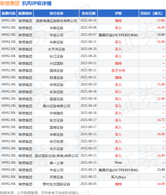 投行对该股的评级以买入为主,近90天内共有15家投行给出买入评级,近90天的目标均价为14.63港元。国泰海通证券股份有限公司最新一份研报给予联想集团增持评级,目标价13.8港元。