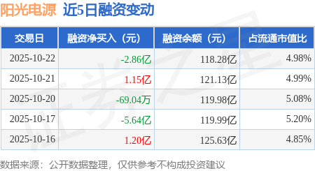 证券之星消息,10月22日,阳光电源(300274)融资买入11.71亿元,融资偿还14.57亿元,融资净卖出2.86亿元,融资余额118.28亿元,近20个交易日中有11个交易日出现融资净买入。