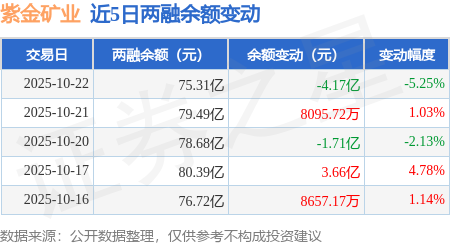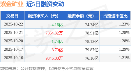 证券之星消息,10月22日,紫金矿业(601899)融资买入6.61亿元,融资偿还10.77亿元,融资净卖出4.16亿元,融资余额74.74亿元,近20个交易日中有13个交易日出现融资净买入。