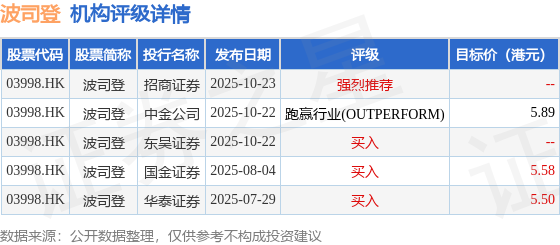 投行对该股的评级以买入为主,近90天内共有3家投行给出买入评级,近90天的目标均价为5.66港元。招商证券最新一份研报给予波司登强烈推荐评级。