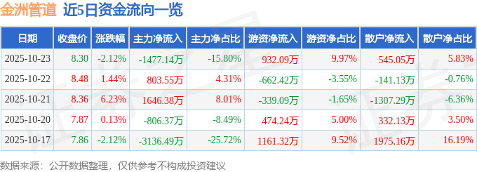 证券之星消息,截至2025年10月23日收盘,金洲管道(002443)报收于8.3元,下跌2.12%,换手率2.18%,成交量11.3万手,成交额9346.58万元。