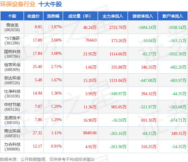 个股表现方面,环保设备行业当日领涨股为雪迪龙(002658),该股当日报收8.85,上涨3.87%,成交量46.24万,主力资金净流入2722.78万元。*ST清研(301288)以上涨3.6%紧随其后,该股当日成交量7044.0,主力资金净流入173.26万元。除此之外,国林科技(300786)、恒誉环保(688309)、菲达环保(600526)均进入当日牛股之列。具体个股列表见下表: