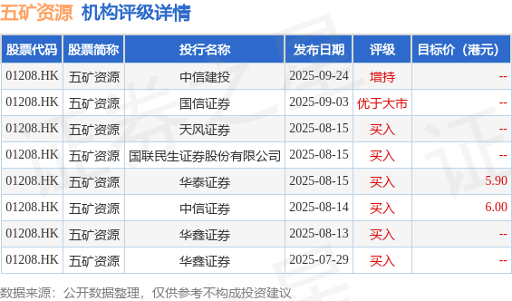 截至2025年10月23日收盘,五矿资源(01208.HK)报收于6.56港元,下跌1.5%,成交量5530.43万股,成交额3.59亿港元。投行对该股的评级以买入为主,近90天内共有6家投行给出买入评级,近90天的目标均价为5.95港元。中信建投最新一份研报给予五矿资源增持评级。