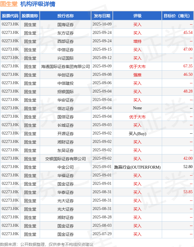截至2025年10月23日收盘,固生堂(02273.HK)报收于29.62港元,下跌1.73%,成交量110.2万股,成交额3248.09万港元。投行对该股的评级以买入为主,近90天内共有19家投行给出买入评级,近90天的目标均价为50.42港元。国海证券最新一份研报给予固生堂买入评级。