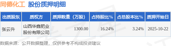 证券之星消息,同德化工(002360)10月23日公开信息显示,股东张云升向山西华鑫肥业股份有限公司合计质押1300.0万股,占总股本3.24%。质押详情见下表: