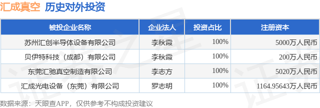 证券之星消息,根据天眼查APP显示,汇成真空(301392.SZ)新增一起对外投资事件,被投资公司为苏州汇创半导体设备有限公司,法定代表人李秋霞,投资占比为100%。该公司从事计算机、通信和其他电子设备制造业,注册资本为5000万人民币。目前,汇成真空共存在对外投资4项,详见下表: