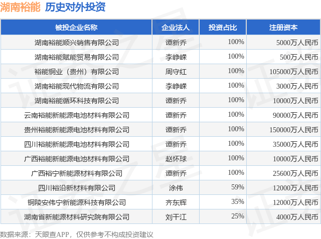 证券之星消息,根据天眼查APP显示,湖南裕能(301358.SZ)新增一起对外投资事件,被投资公司为湖南省新能源材料研究院有限公司,法定代表人刘干江,投资占比为25%。该公司从事研究和试验发展,注册资本为4000万人民币。目前,湖南裕能共存在对外投资13项,详见下表: